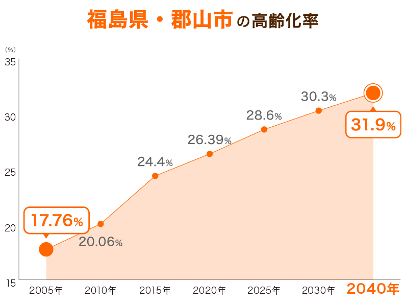 ただし、福島県内の他市町村に比べると、郡山市の高齢化率は比較的低め。